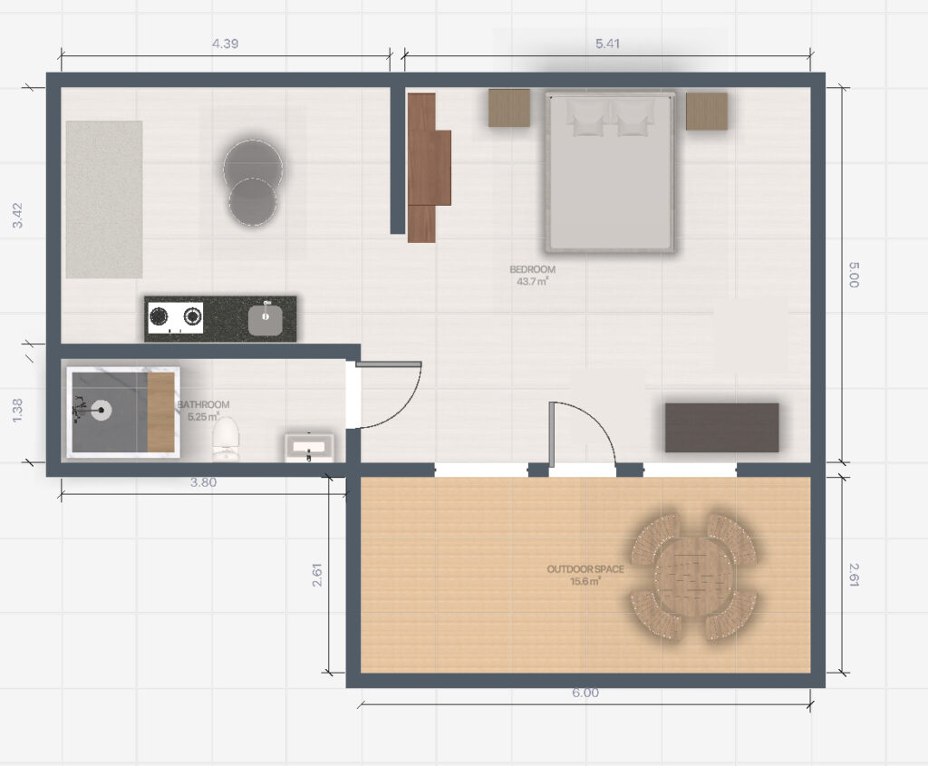 Cocineta equipada con estufa eléctrica, microondas y utensilios